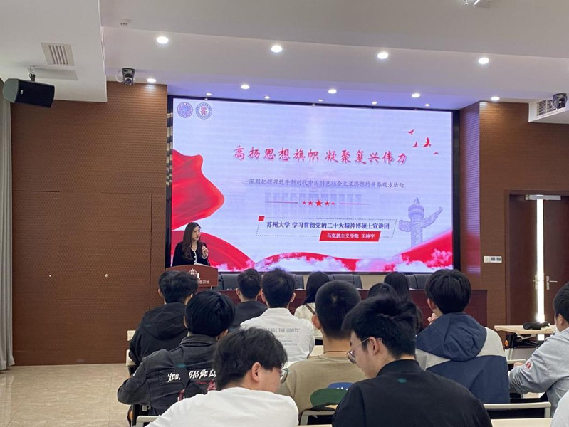 马克思主义学院研究生第一党支部组织委员王林宇做题为“高扬思想旗帜 凝聚复兴伟力——深刻把握习近平新时代中国特色社会主义思想的世界观方法论”的宣讲。她从“传承”“超越”“坚持”三个角度详细阐述了习近平新时代中国特色社会主义思想的世界观方法论,并强调要通过学习“六个坚持”来运用好贯穿其中的立场观点方法,不断推进马克思主义实践基础上的理论创新。