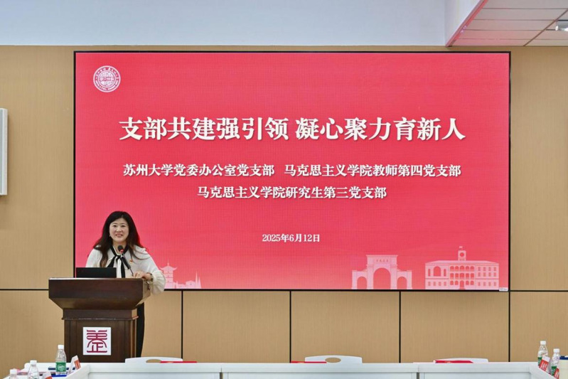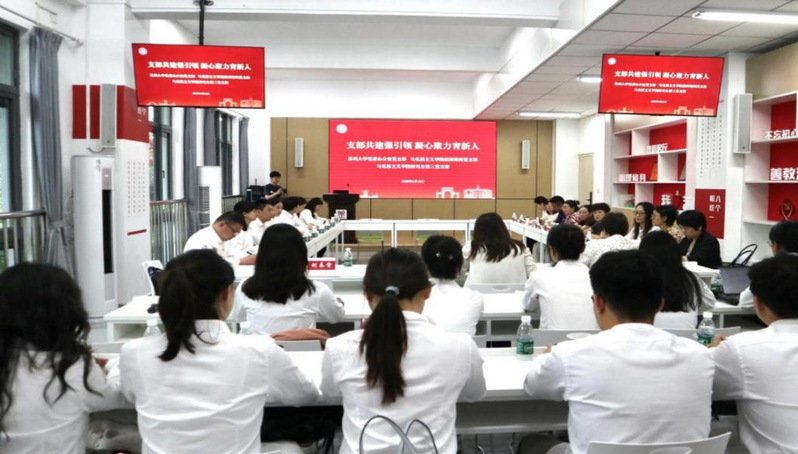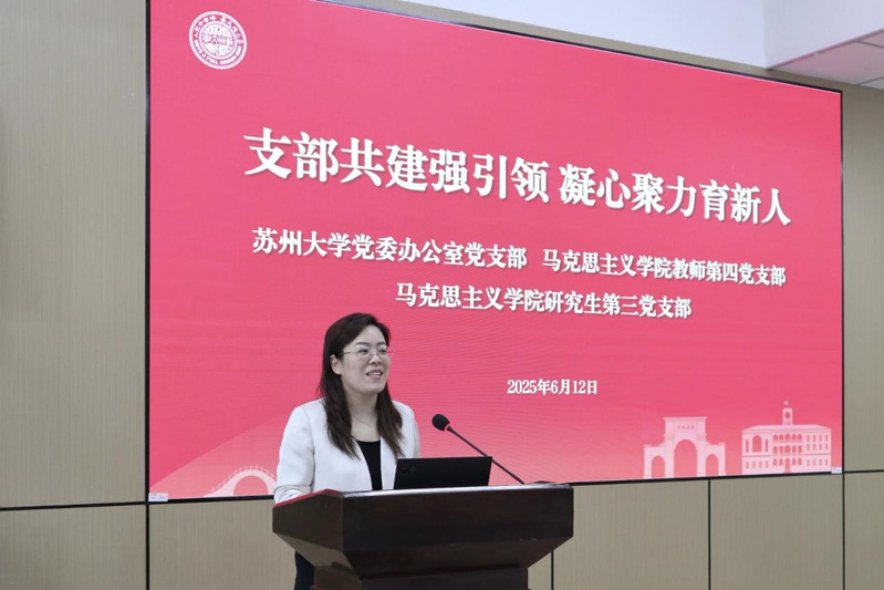 为深入学习贯彻习近平新时代中国特色社会主义思想,落实新时代党的建设总要求,进一步提升党支部的政治功能与组织功能,以支部共建强化优势互补、资源共享和协同育人,6月12日,苏州大学党委办公室党支部、苏州大学马克思主义学院教师第四党支部、苏州大学马克思主义学院研究生第三党支部在养正社区理响讲堂举行共建签约仪式,并开展“支部共建强引领 凝心聚力育新人”主题联学实践活动。校党委组织部副部长、党校副校长薛曦出席活动并讲话。校党委办公室主任、党委办公室党支部书记刘春雷,校党委办公室副主任、党委办公室党支部副书记沈玮,马克思主义学院党委书记茅海燕,党委委员、副院长朱蓉蓉,党委专职组织员王静,学生党总支书记金鑫,教师第四党支部书记胡绿叶,研究生第三党支部书记姜轶宁,以及三方党支部的全体党员参加了本次活动。活动由马克思主义学院党委副书记、副院长蒋慧主持。