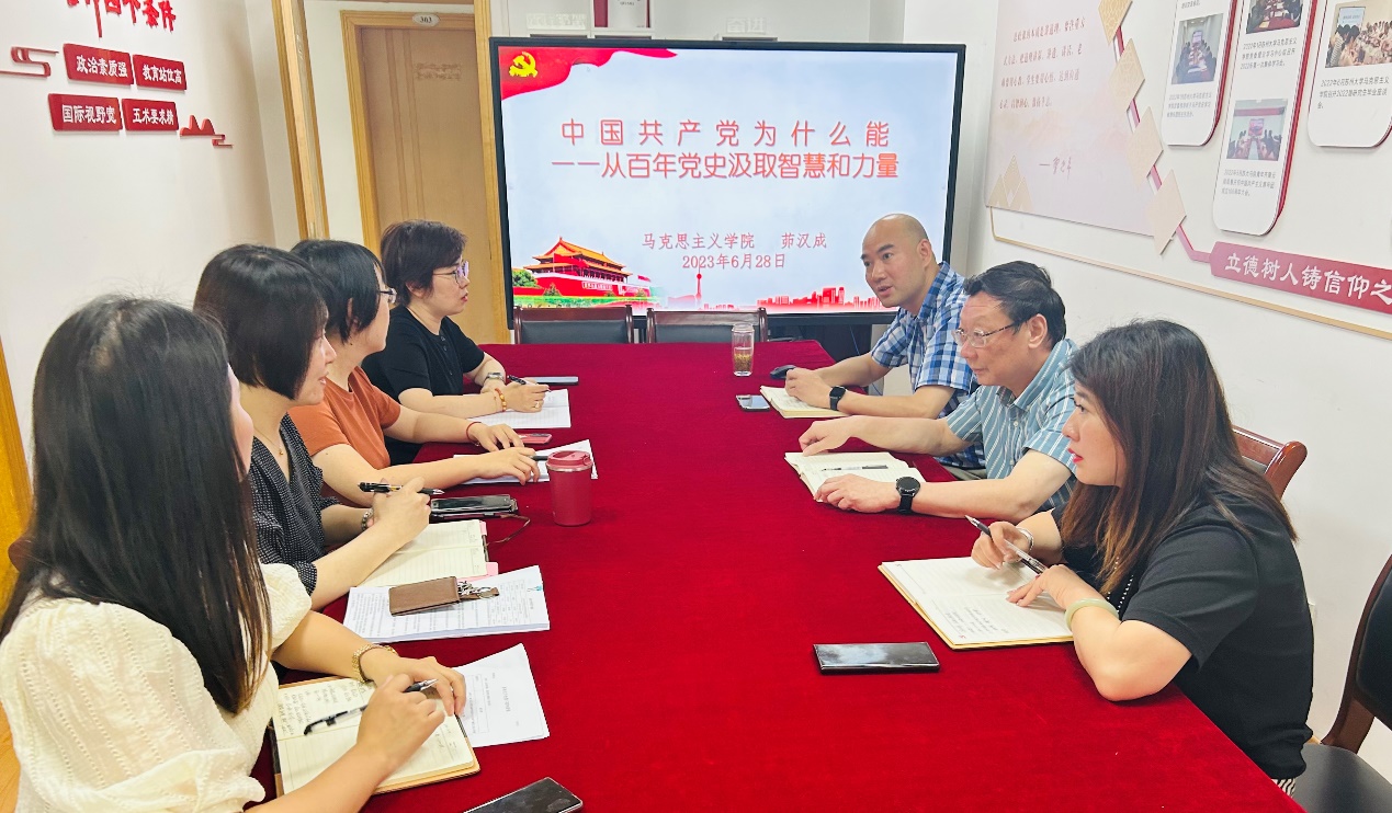 根据学习贯彻习近平新时代中国特色社会主义思想主题教育相关工作部署,2023年6月28日上午,马克思主义学院副院长茆汉成在凤鸣楼304会议室,以《中国共产党为什么能——从百年党史汲取智慧和力量》为题讲授党课。学院党委书记陈建军,党委副书记、副院长蒋慧,行政党支部书记李文娟,综合办公室主任刘慧婷,教师发展中心主任刘媛媛,教务秘书徐云露等参加党课学习。党课由行政党支部书记李文娟主持。