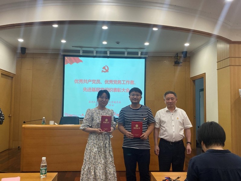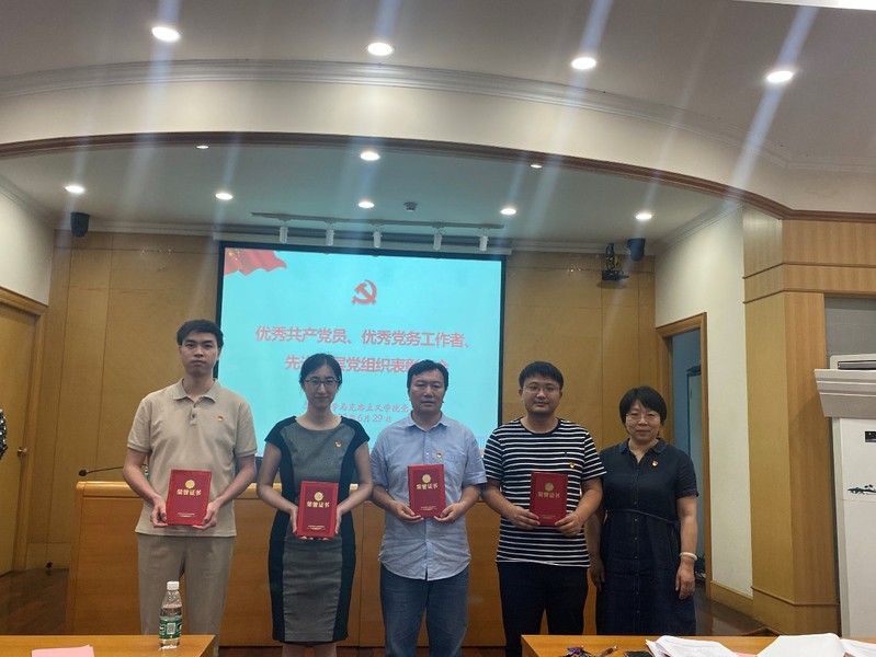 学院党委委员姜建成、副院长茆汉成为受到学院党委表彰的优秀共产党员代表颁发荣誉证书,并合影留念。