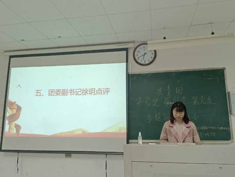 第五部分是团委副书记徐玥对本次团员组织生活会进行点评。徐玥对同学们的学习热情和学习成果做出充分肯定,并表示作为马院团员要坚定理想信念,不忘初心使命,与新时代同向同行,把青春奋斗融入党和人民的事业,努力成为堪当民族复兴重任的时代新人。