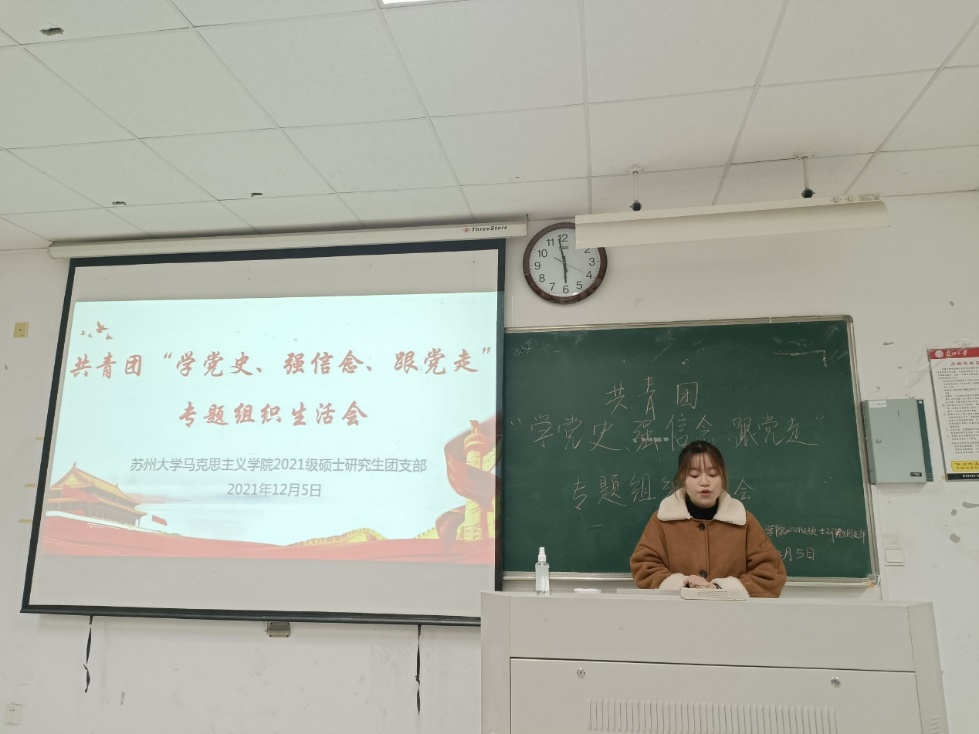 团委于12月5日在独墅湖校区606号楼6110教室顺利召开“学党史、强信念、跟党走”专题团员组织生活会。本次活动由2021级硕士研究生李雪霜主持,直播