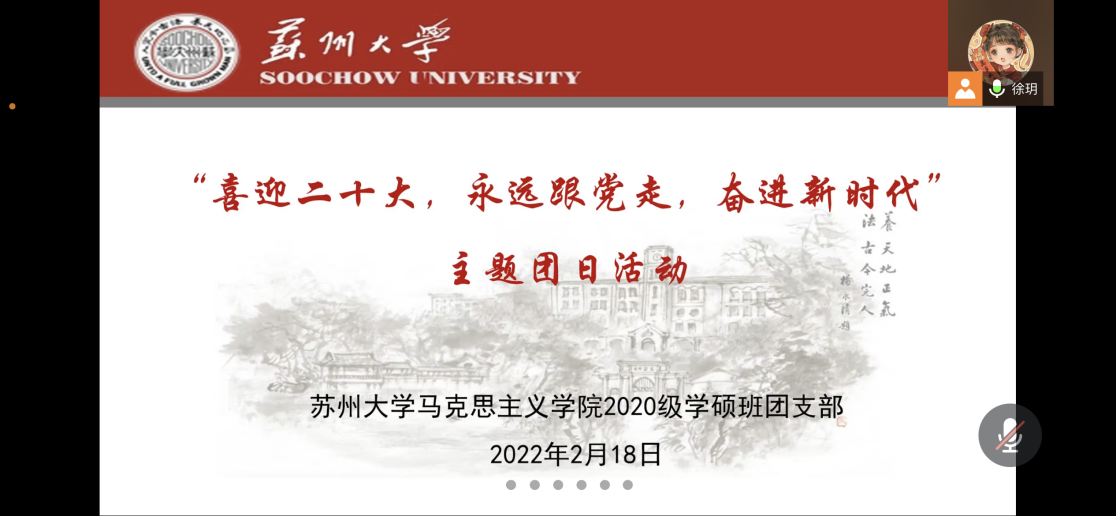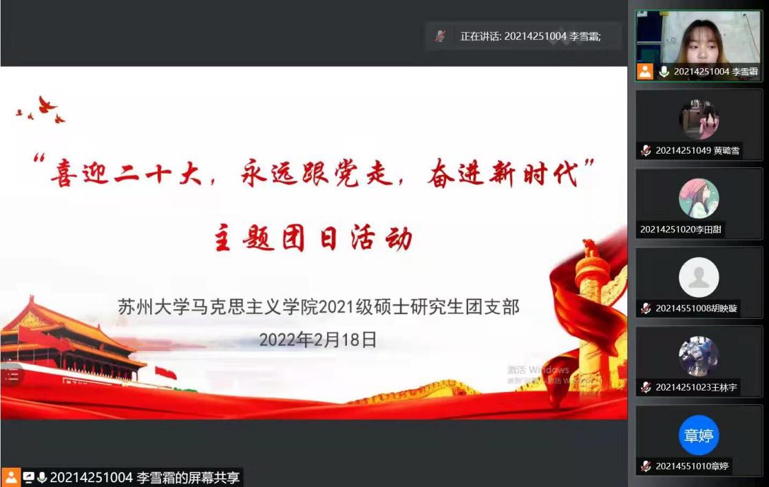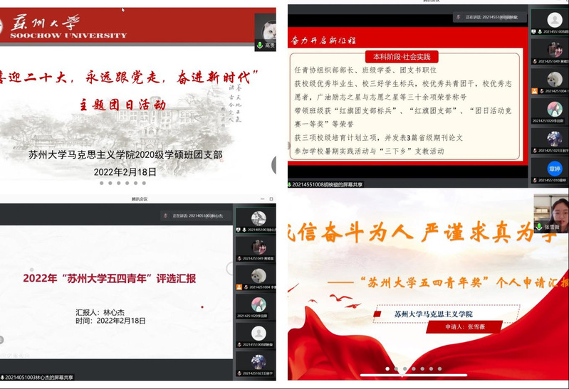 此次主题团日活动的主要内容是学院团委积极响应学校团委号召,开展“苏州大学五四青年奖”评选活动在线分享和交流,目的在于激励广大团员青年向先进个人和先进集体看齐,激励团员青年为迎接建团一百周年和党的二十大贡献青春力量。活动中,2020级和2021级6名团员青年以及行政团队和青年志愿者协会分别进行事迹分享与交流。他们分别从志愿服务经历、科研成果、工作成绩、荣誉获奖等方面进行个人或团队风采展示,大家纷纷表达了向党看齐、心怀人民、服务大众、接续奋斗的坚定决心。