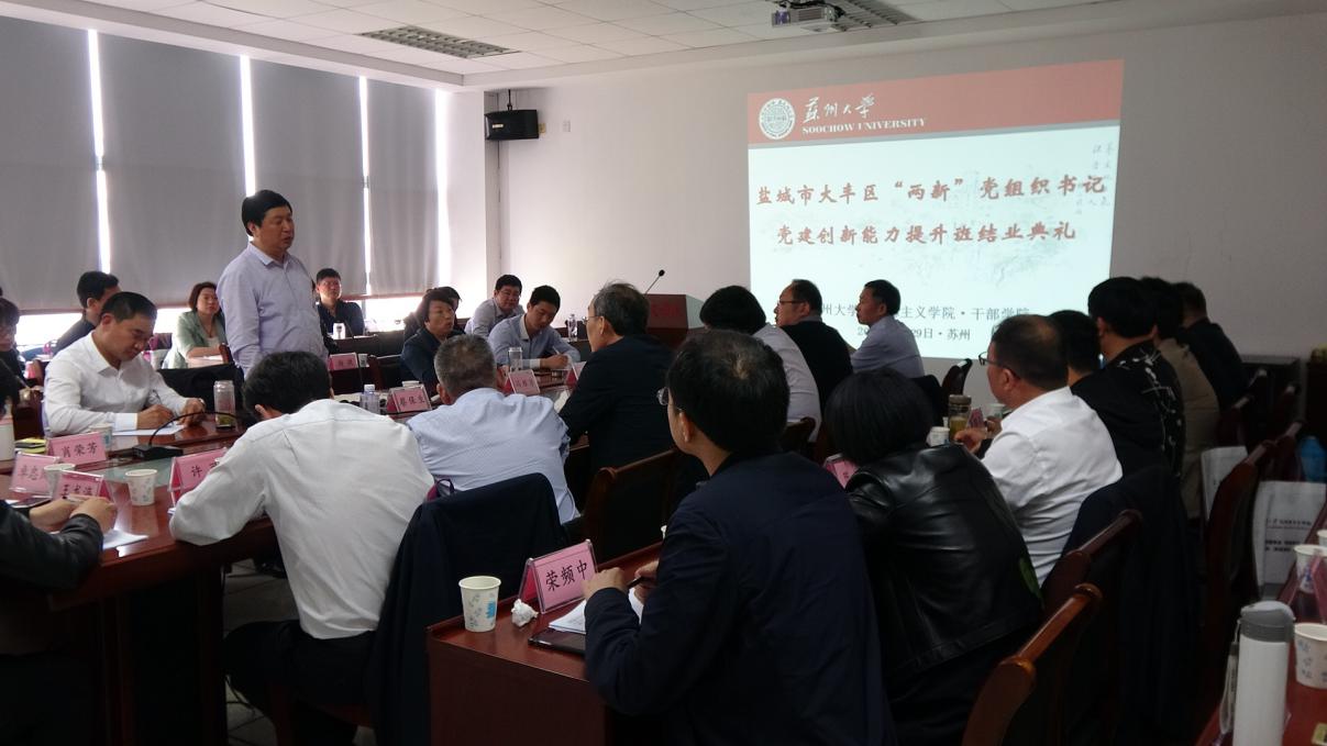 29日上午,研修班结业典礼在直播 会议室举行,干部学院办公室主任吉启卫主持了结业典礼。盐城市大丰区委组织部部长蔡保生出席结业典礼并讲话。他表示,本次培训班从准备到成行,从按时开班到顺利结业,时间紧、任务重,直播 干部学院在很短时间内就完成了课程设定,使培训班能够在直播 干部学院顺利举行,这离不开学院领导的关心支持,也离不开干部学院办公室工作人员和研究生的辛勤付出。特别是屈红凯副主任在全程的跟班服务付出了大量的时间和精力,高效满足培训班学员对培训工作提出的新要求,以及我院优秀硕士研究生、干部学院助理胡玉珍、章咏芳、毛瑞康、张巩轶在整个培训过程中所做的大量细致而周到的幕后工作,充分体现了直播 干部学院办班实力。希望各位学员要学以致用,在以后的工作中,一是要做到尽责。切实做到守土有责、守土尽责,力争把大丰区的党建工作继续推向新台阶。二是要做到增效。党建工作做好了对企业发展很有作用,要以党建高质量发展引领企业高质量发展,要把此次培训学习转化为企业发展实效。三是要做到融合。融合是要将党的建设内化于心、外化于行,让党的建设工作像我们生活中的空气一样,能够润物无声。四是要做到探索。要围绕党的建设与企业发展二者之间的关系,探索出一条具有中国特色的现代企业发展道路,建构现代企业管理制度,实现基层党建引领企业发展。