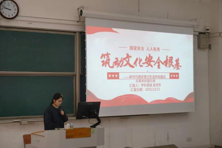 2025级本科生范佳瑜和2025级硕士研究生阮卓怡、谌琼巧、吴芳芳分别就“中国全球安全观的文明底色与时代叙事”“人类命运共同体视域下国际共同安全的科学内涵、核心逻辑与实践路径”“筑牢文化安全根基:新时代高校意识形态阵地建设与青年价值引领”“中国全球安全观的文明底色与时代叙事”进行主题汇报。