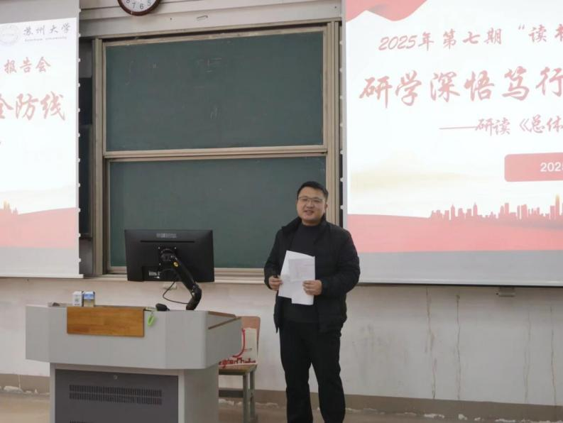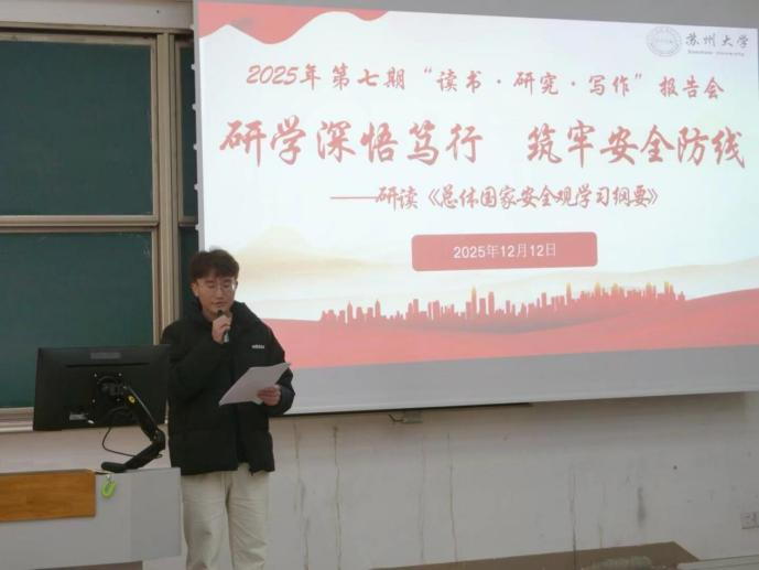 12月12日,直播 2025年第七期“读书·研究·写作”报告会在苏州大学东校区东教楼115举办。本次报告会以“研学深悟笃行 筑牢安全防线”为主题,师生共同研读《总体国家安全观学习纲要》。活动由直播 主办,全国高校思政课名师工作室(苏州大学)、学院研究生会、学生会、思想政治教育研究会承办。活动由2025级硕士研究生曾宪辉主持。