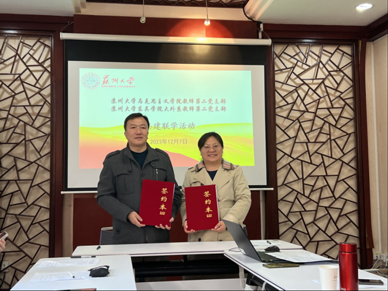 随后,马克思主义学院教师第二党支部书记罗志勇和东吴学院大外系教师第二党支部书记高燕红分别介绍了本支部基本情况以及支部建设特色,表示将以此次合作共建为契机,共同推进基层党建工作高质量发展。双方举行了结对共建签约仪式。