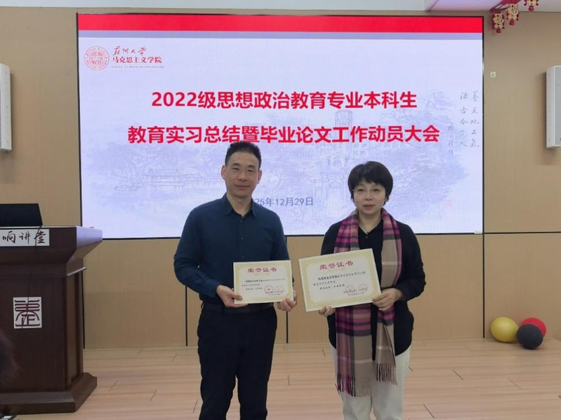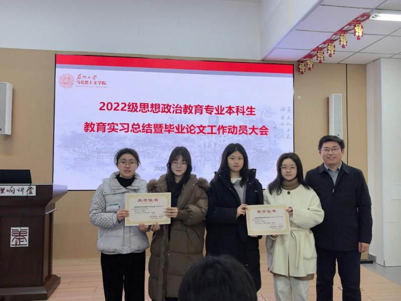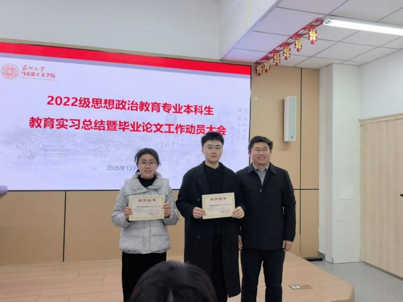 评优颁奖仪式上,朱蓉蓉副院长、孔川院长助理分别宣读教育实习优秀指导老师、优秀实习生及优秀小组名单,并颁发荣誉证书。缪智轩、郑欣怡获评优秀实习生;西安交通大学苏州附属中学实习小组、苏州实验中学实习小组获评优秀实习小组。此外,我院获评苏州大学2026届教育实习先进单位。
