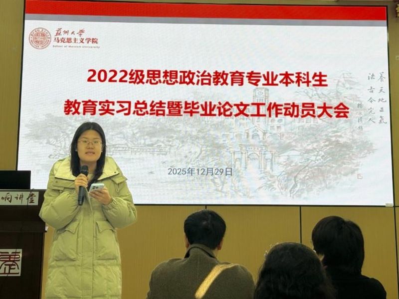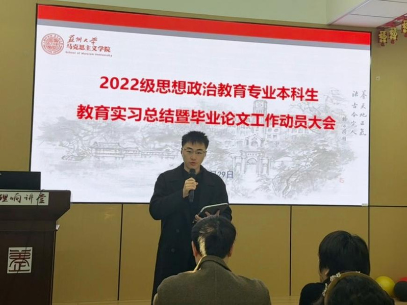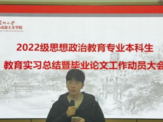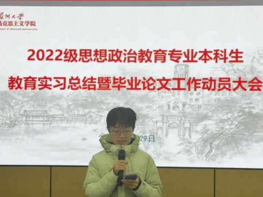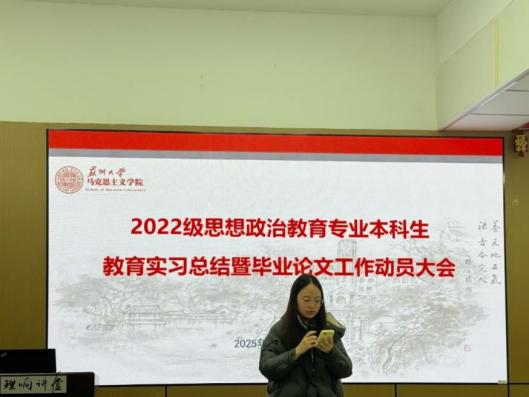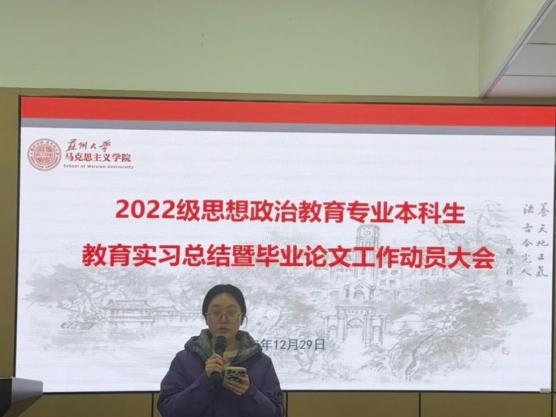 12月29日上午,直播 2022级思想政治教育专业本科生教育实习总结暨毕业论文工作动员大会在养正社区理响讲堂顺利举行。学院副院长朱蓉蓉,院长助理孔川,思想政治教育系主任王淼、副主任张建晓、教师代表,教务秘书揭雨晨及2022级思想政治教育专业全体本科生参会。会议由王淼主任主持。