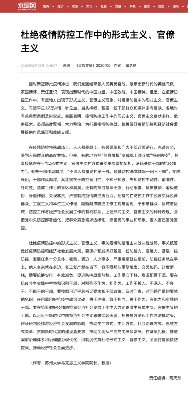 田芝健:杜绝疫情防控工作中的形式主义、官僚主义