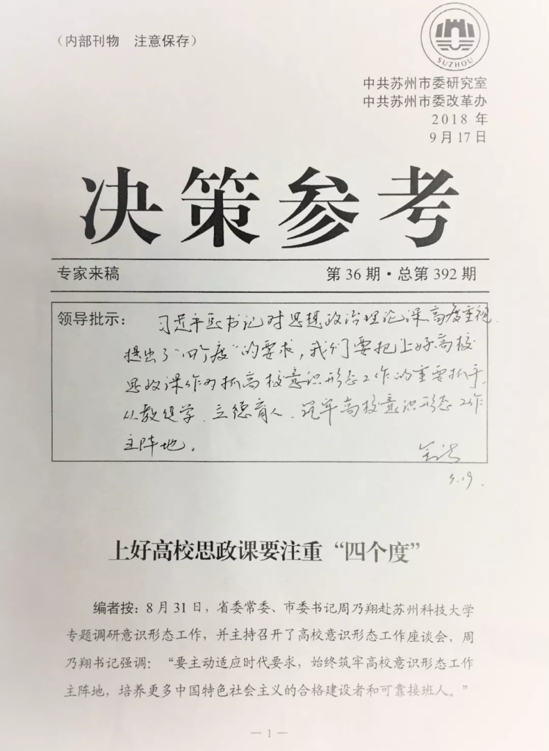 东吴智库首席专家、马克思主义学院教授方世南的《上好高校思政课要注重“四个度”》一文,刊登在苏州市委研究室主办的《决策参考》2018年第36期上。9月19日,苏州市委常委、宣传部长金洁对该文作出重要批示:“习近平总书记对思想政治理论课高度重视,我们要把上好高校思政课作为抓高校意识形态工作的重要抓手,以教促学,立德育人,筑牢高校意识形态工作主阵地。”