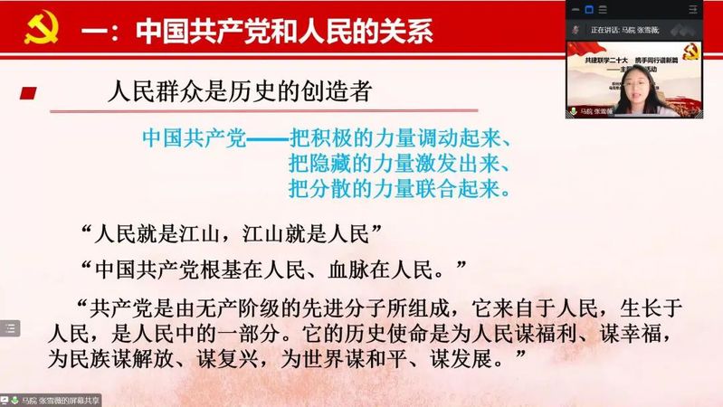 马克思主义学院学生党总支书记金鑫在发言中指出,党的二十大是一次主题鲜明、方向明确、意义重大的会议,希望同学们围绕党的中心任务,坚持基本原则,加强理论学习,发扬斗争精神,增强忧患意识,敢想敢为又善作善成,与党同心、与党同行,做为党和人民事业艰苦奋斗的新时代好青年。马克思主义学院党的二十大精神硕博士宣讲团成员张雪薇进行了“‘两个维护’中党性和人民性的统一”的主题宣讲。她从“中国共产党和人民的关系”“党和党内领导核心的关系”“党内领导核心和人民的关系”三个方面详细阐述了“两个维护”中党性和人民性的统一,希望同学们坚持马克思主义的指导和中国共产党的领导,坚决做到“两个维护”。